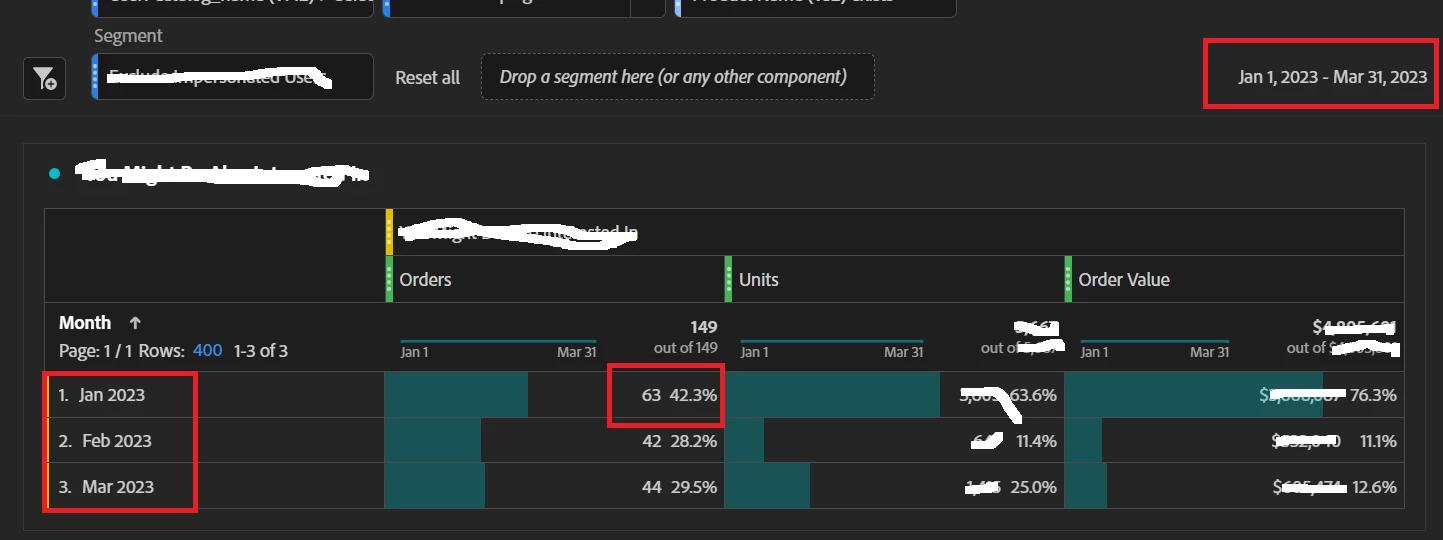 - Looking at Month 1 AND 2, now that the user matches the criteria, all orders for this user (and all the user pages, actions, etc) are being returned, which also changes the Month 1 part of the report.