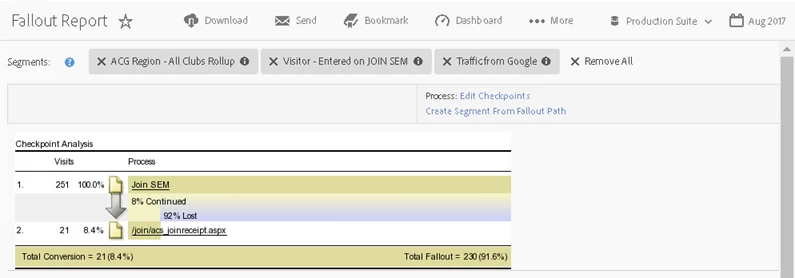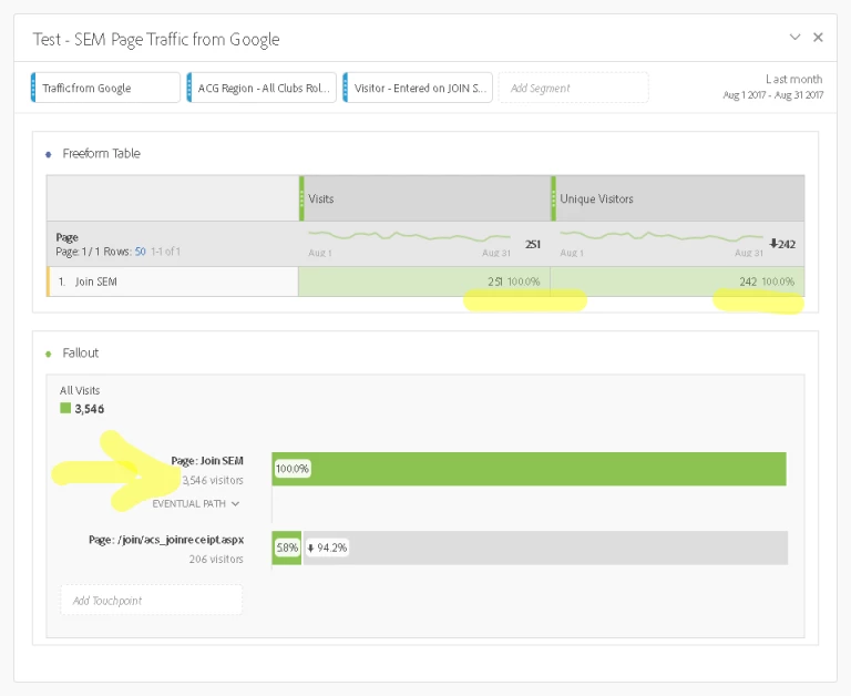 In Adobe Workspace I created a report that should be listing the same data twice but the data is not the same. The first is just a listing by "page" dimension of the landing page's unique visitors (report has month of August defined and there are no other date selections in the report). The second is a fallout report where the page above is the start page of the fallout. On the fallout, however, the "visits" are completely different from the "unique visitors." The unique visits at the top is listing less than 300 unique visitors and the page at the start of the fallout is listing over 3,000 visits. Even though these figures shouldn't be that far off even with the difference in metrics, I changed the first report to "visits" to see if the numbers would then match. They did not. Still way off.