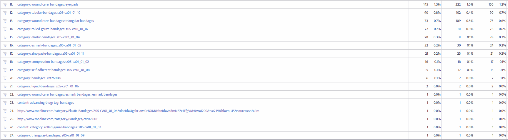 I am pulling a pages report to filter to only pages with category in their name. Our website catalog pages all start with that structure after the domain name. When I pull a pages report, I also see the URL structure after the domain and full URL entries in the report. I have an screenshot from the debugger showing the page name that is set up but in the report I also get key metrics on the following entries below. PV, Visits and Uniques are lower on the other entries than the real page name but when I sum them all, it is a noticeable number missing. As an example in the Pages Report - lines 11, 13, 22 are correctly labeled. Lines 12, 14, 15, 16, 17, 18, 19, 20, 21, are examples of the data after the domain being passed and lines 24 and 25 are examples of the full URL being listed.