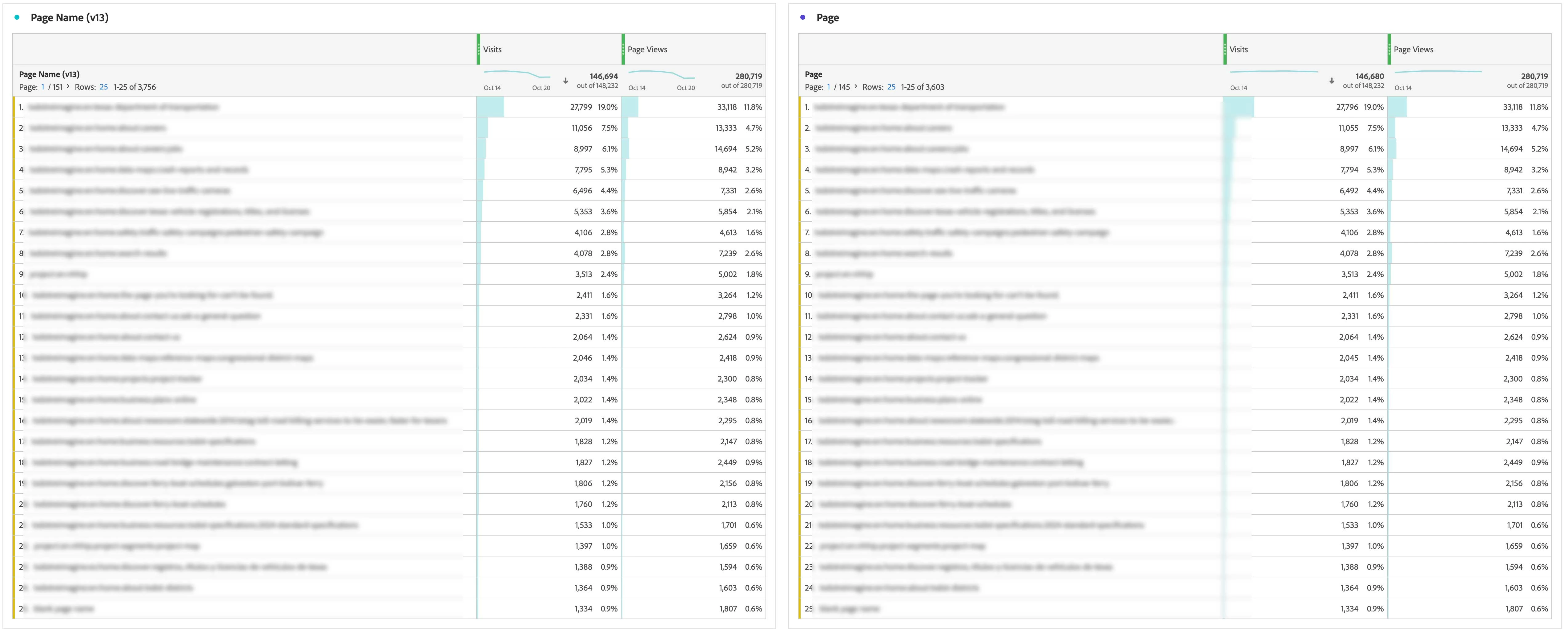 your "Page Name" is a custom dimension, eVar13 whereas the Page dimension is the standard Adobe dimension, filled by the s.pageName attribute in your tracking calls.