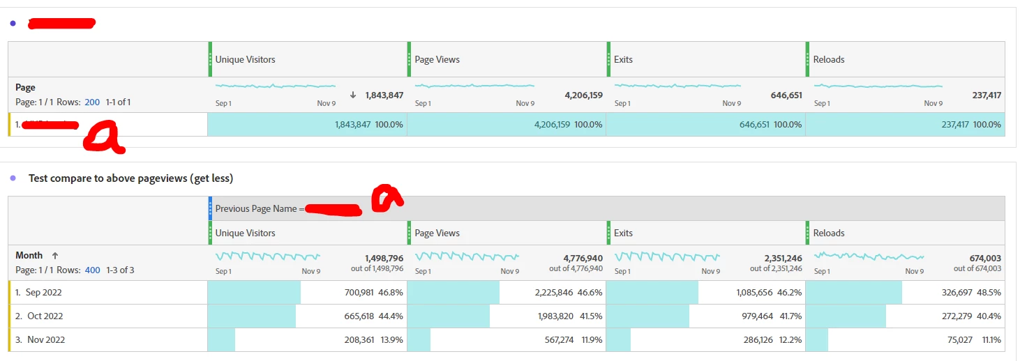 I'm trying to figure out how the top chart has more pageviews that the bottom chart. For context, the top chart is just looking at pageviews where the previous page is the page from the bottom chart. The bottom chart just totals the pageviews for that page. I'm having trouble understanding how it could be more. Shouldn't it be the same or less if users drop off or their last hit is the page from the bottom chart? If a user were to visit a new page or refresh after the page view of the previous page segment from the top, the previous page name would change, so it doesn't make any sense. Is the previous page name evar a session related metric when look at pageviews and it's summing up all pageviews where a session had a hit of previous page name?