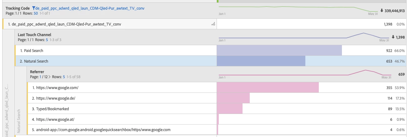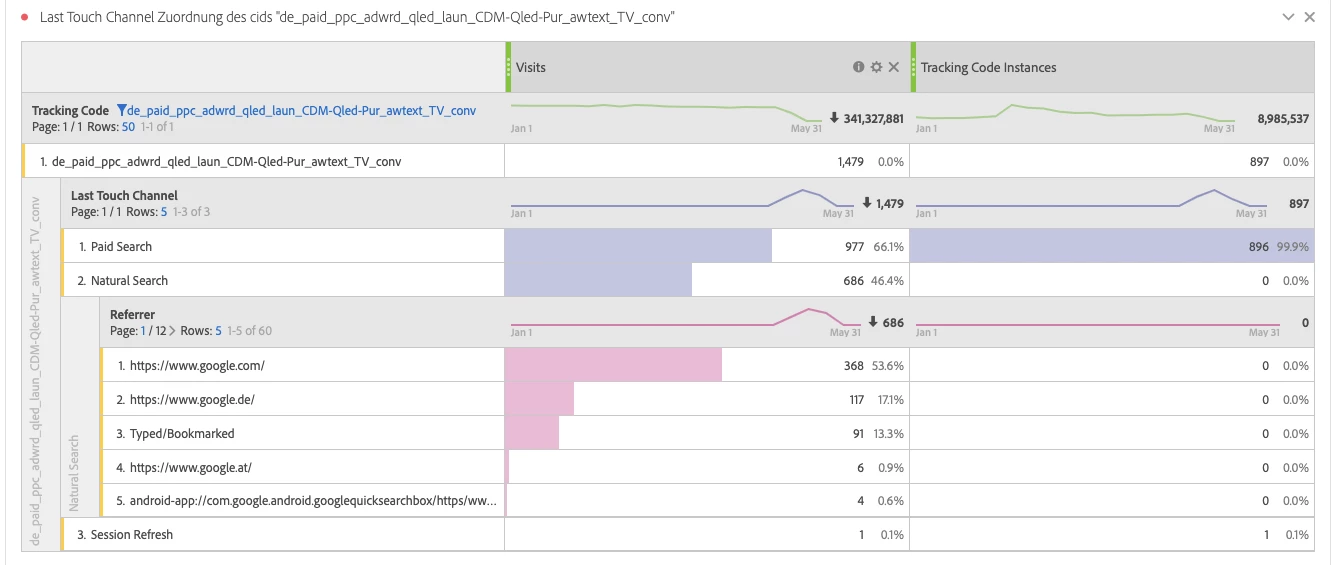 remark: you see a difference on the "tracking code visits" (sum -> 1'479) lower than single rows (977 + 686). the difference are those match "same visit" because the sum is de-dublicated (1 visit for the tracking code) both both a 1 for each row.