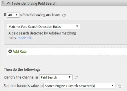 My Paid Search Detection rule contains following Filters: "ppc", "&ppc=", "?ppc=", "?pid=", &pid="