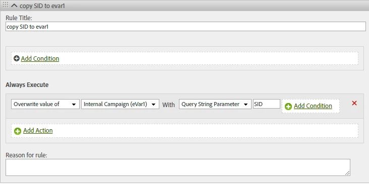 I have a new Implementation request that I need to Pass query string 'SID' explicitly only to my Global Report Suite and I need to assign an 'X' Variable to it. Can some one help me how to track this using 'Processing Rules'. I'm completely beginner to Processing rules. I have gone through the Vidoe and documentation but I couldn't able to get the required outcome.