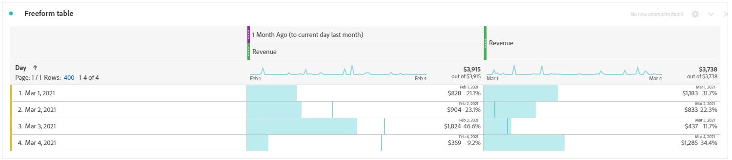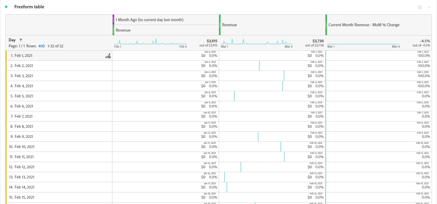 Is there an ability to calculate percent change on a line by line basis (such as broken down by all days in a month)? I have built a calculated metric (since we do not have the automatic Percent Change feature when a table is broken down by day/week/month, etc.) that will show the aggregated percent change, but it breaks my Workspace. I am looking at revenue for this month to date, and built a rolling date range to look at this month to date last year. Ideally, the table would be displaying March 1st - 4th. As soon as I apply my calculated metric for percent change, the table becomes 369 rows long and displays March 2nd, 2019 through today and the percent change is not accurately reflected. I've attached screenshots of an example comparing this month to last in our dev report suite. Here is a link about the same issue, posted about in 2018: https://experienceleaguecommunities.adobe.com/t5/adobe-analytics-ideas/quot-percent-change-quot-in-workspace-smarter-calculation-based/idi-p/333478