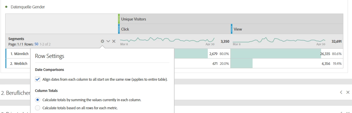 just one question: is there any possibility to get the percentage of the row in this case? So i mean something like "percentage of row" which is not available? in this case i need something like a click / view Ratio. so i have created two segments, where on the one hand just clicker on an advertising are counted and on the other hand just the viewer but not the clicker on an Advertising are counted. what I need now is the ratio of the clicker to the viewers, because i want to know, how many users, who have viewed an add, also clicked on that add. or do i need a calculated metric? because on this screensot i just see the percentage of the column.