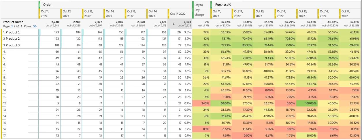 E.g. a table shows all Product Name those Order more than 20 AND Purchase% lower than 40% in 17-OCT (last day, latest day). - Keep all the past 7 days data.