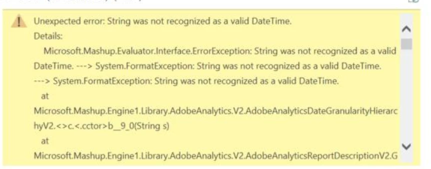 When using PowerBi with the 2.0 (Beta) implementation for analytics, whenever I try to add "Year" from "Date Granularity" I am getting this error which seems to be saying that "Year" is a string (I can't see a method to change this either):