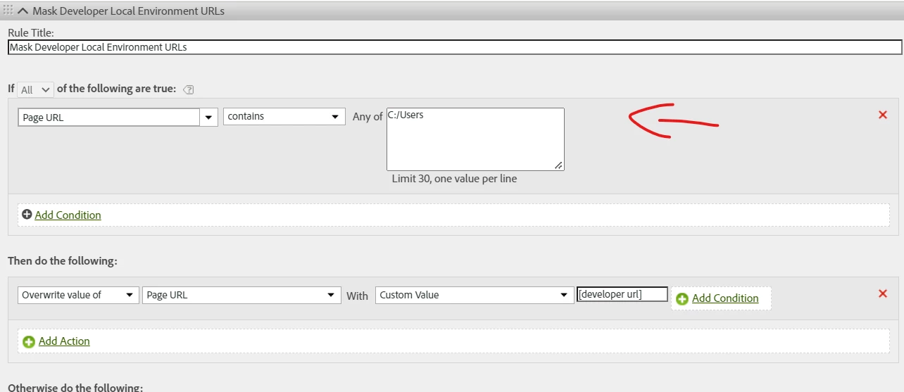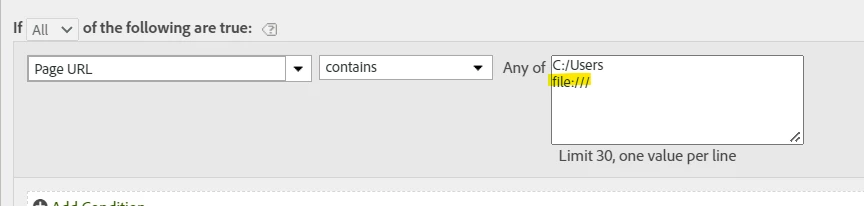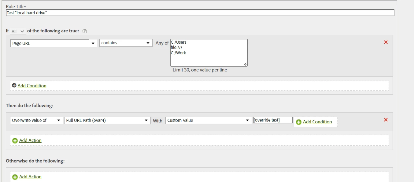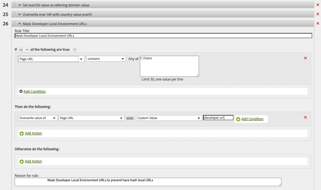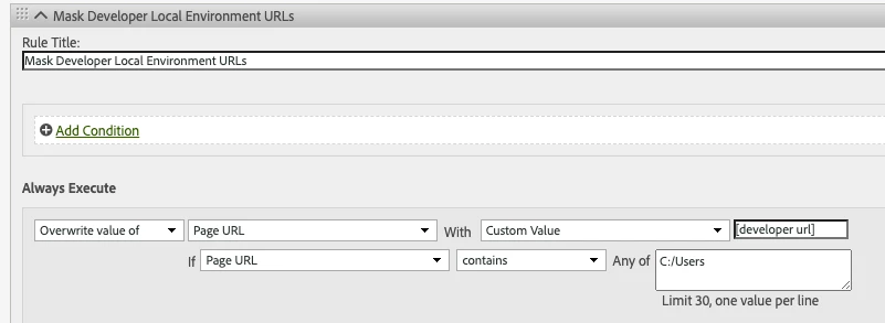 I want to filter the Page URL because sometimes I got local developer URLs in reports. I created this processing rule in order to have a common value for all of them to filter it in Virtual Report Suites later. But the rule is not working. One option in here I think is because the value "C:/Users" will required an escaping of special character.