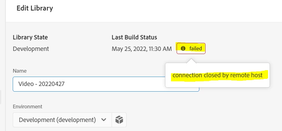 The list build status is showing failed in my development library(PFA screenshot below) and reason is showing "connection closed by remote host".
