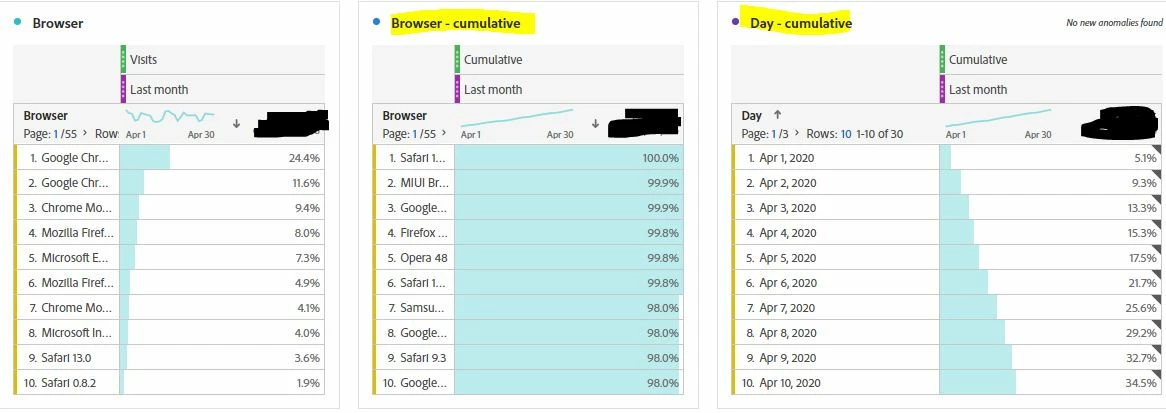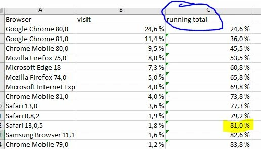 I can easily list the percentage share of each browser, but how to make a calculated metric that would list the browsers needed to break that 80% threshold. For example on the snip attached the last browser would be Safari 13.0.5