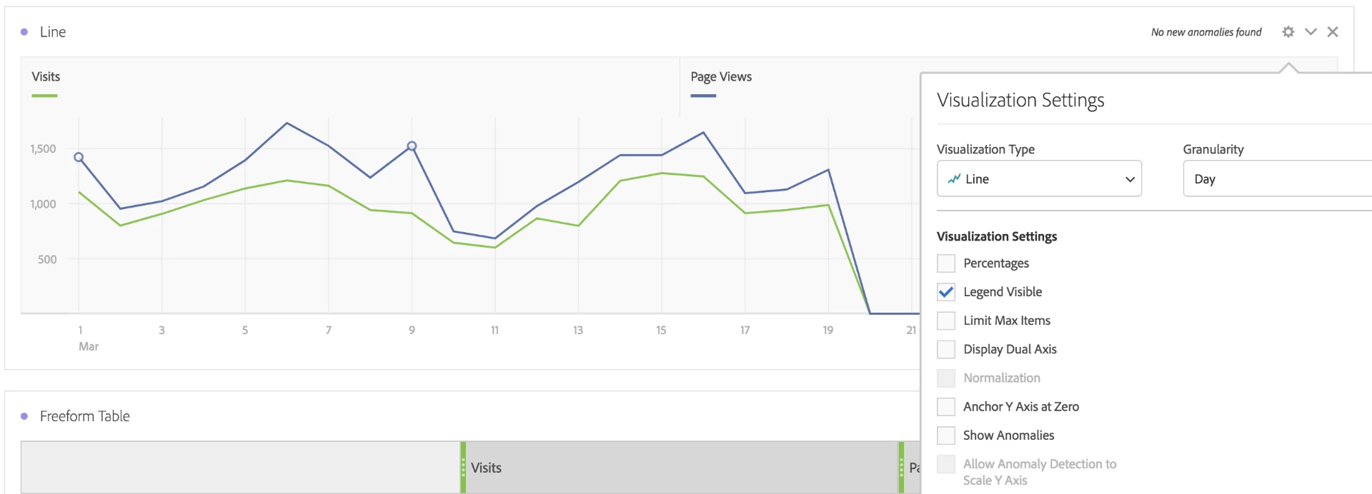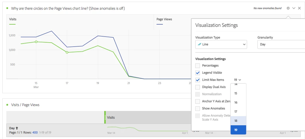 Unfortunately that seems to have no effect. Below I have chosen the max items allowed of 19, although because of my date selection of Mar 14-Apr 1, it seems Adobe Analytics has decided Mar 15 and 17 have anomalies for the Visits metric.
