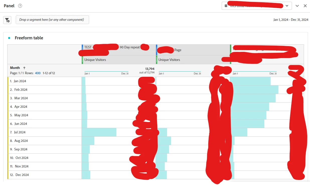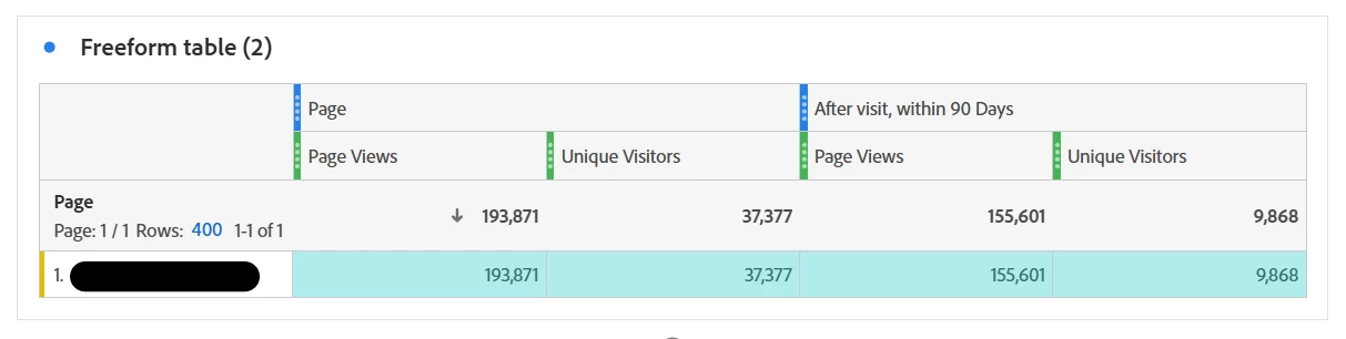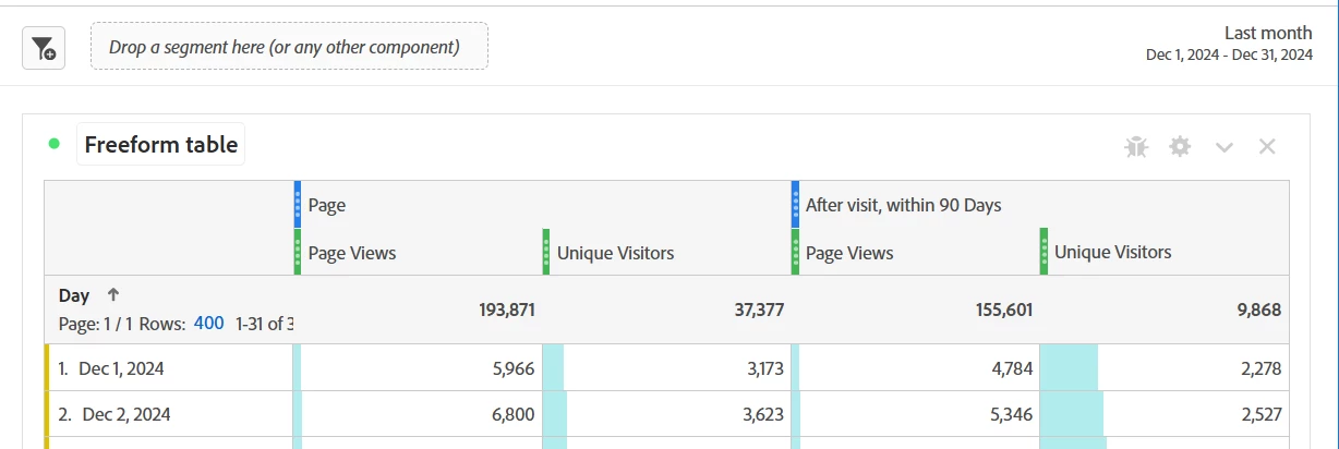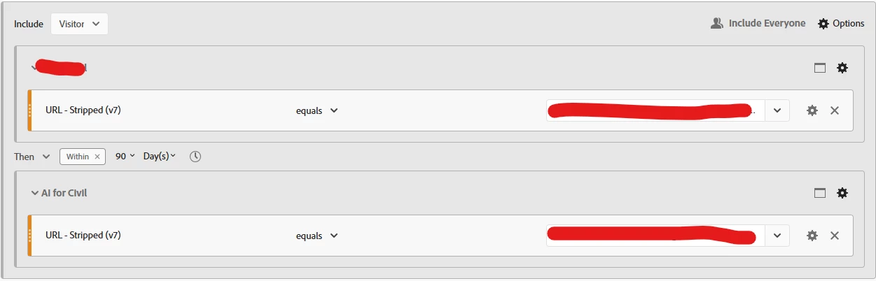 I'm trying to come up with a way to easily show when a visitor sees a specific URL and then comes back to that same URL in 90 Days. I think this is the right way to think about my segment? My question is though, is there an easy way that I can show this for Repeat Visitors by Month, Week, etc. granularity? In other words, if I take this segment and then expand my date range in freeform and add month as a dimension, is that a problem? Is this just going to look at visitors that did this at any point in time based on the segment and then sum up the users for that month (whether they did it that month or not?) If so, how can I alleviate that? Or am I going to have to do this in Downstream DB and SQL?