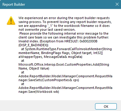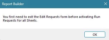 I use report builder to update monthly sheets. Since this months the 'Manage' button does not load / show the wizard to manage all my data blocks. When I click on 'Refresh' though after having clicked on 'Manage' it gives an error message that the 'Edit Requests form' first needs to be exited (see screen shot). When I first click on 'Refresh' it runs the refresh for all data blocks. I have tried to restart my computer, I have deinstalled and reinstalled report builder (version 5.6.57). I use Microsoft Excel for Microsoft 365 (version 2410). Does anyone have an idea what to do and how to solve that?