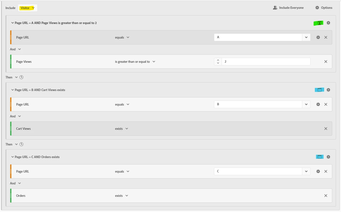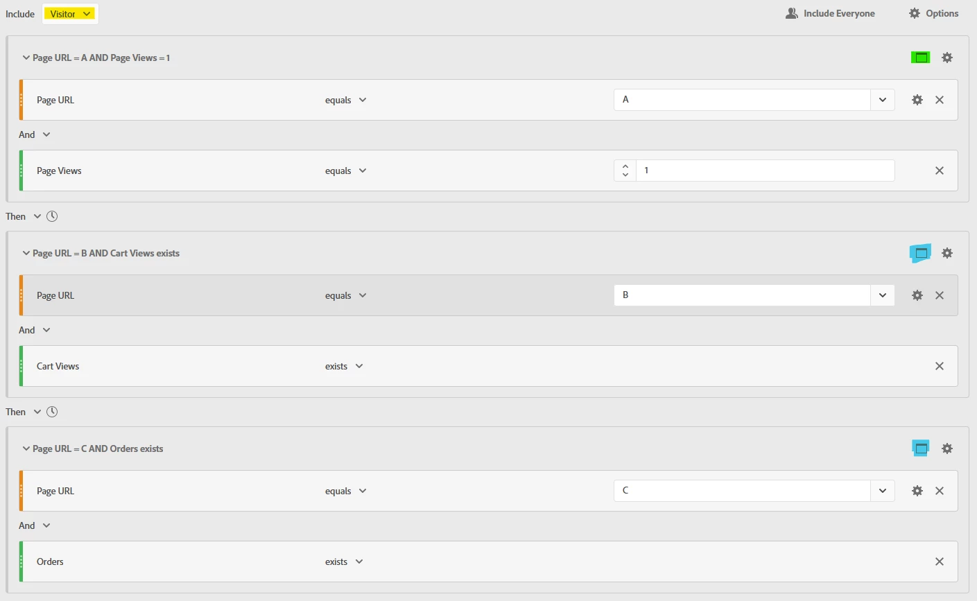 I need some clarification after trying to understand Adobe's sequential segmentation documentation. Basically, what I am trying to compare is the number of visitors who proceeded to purchase items after viewing Page A once (first segment) and more than once (second segment).