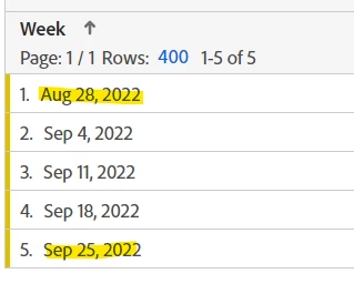 Hello! There is a question related to `Reporting API`. We send a request containing a dimension `variables/daterangemonth`. According to this documentation ( https://github.com/AdobeDocs/analytics-2.0-apis/blob/master/reporting-guide.md#example-response ) we expect to get a response in the format "Month Year" (e.g. "Sep 2022"). But in some cases the response incorporates an additional information e.g. "Sep 2022 (Aug 28-Oct 1)".