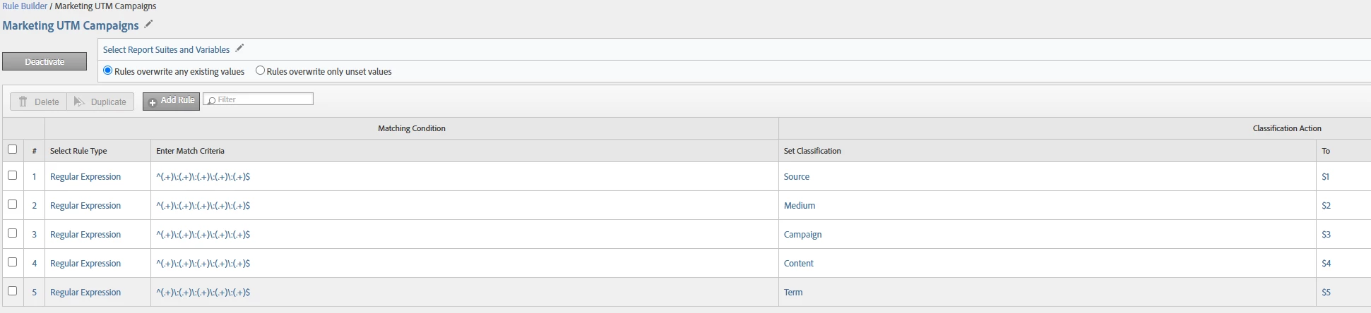 I'm still pretty fresh to Adobe Analytics (I was primarily a WebTrends user and currently Google Analytics) and I'm working through enabling reporting on UTM parameters in Adobe Analytics. I've used this article as a baseline guide (https://medium.com/@utmsmartmanager/the-complete-guide-to-using-utm-parameters-in-adobe-analytics-dfce81b91938). I'm at the point now where we have code deployed to collect the UTM parameters from the URL (when present) and pass them in a single string to the campaign variable. I added the classifications, set up the classification rules (regex method), and linked the rules to my report suites.