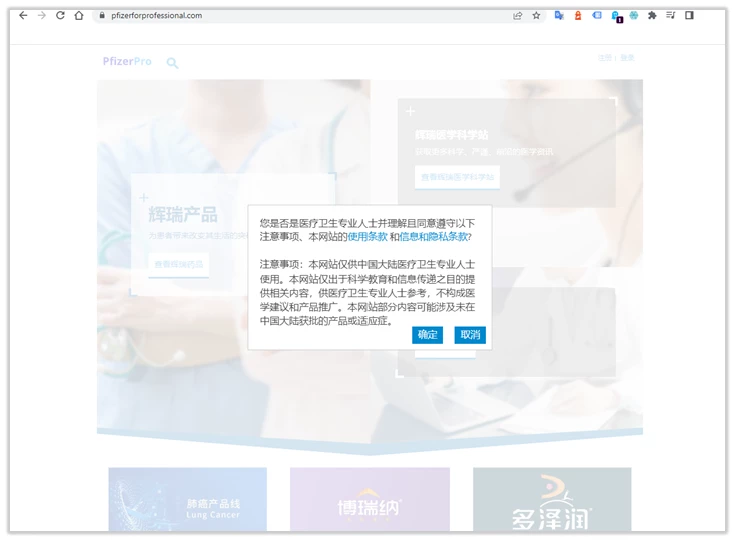 When the user first lands PfizerPro, a pop up window will be displayed as below. Only user clicks "confirmed" button, they can continue to browse the content. (Click "cancel", user will be blocked from browsing)
