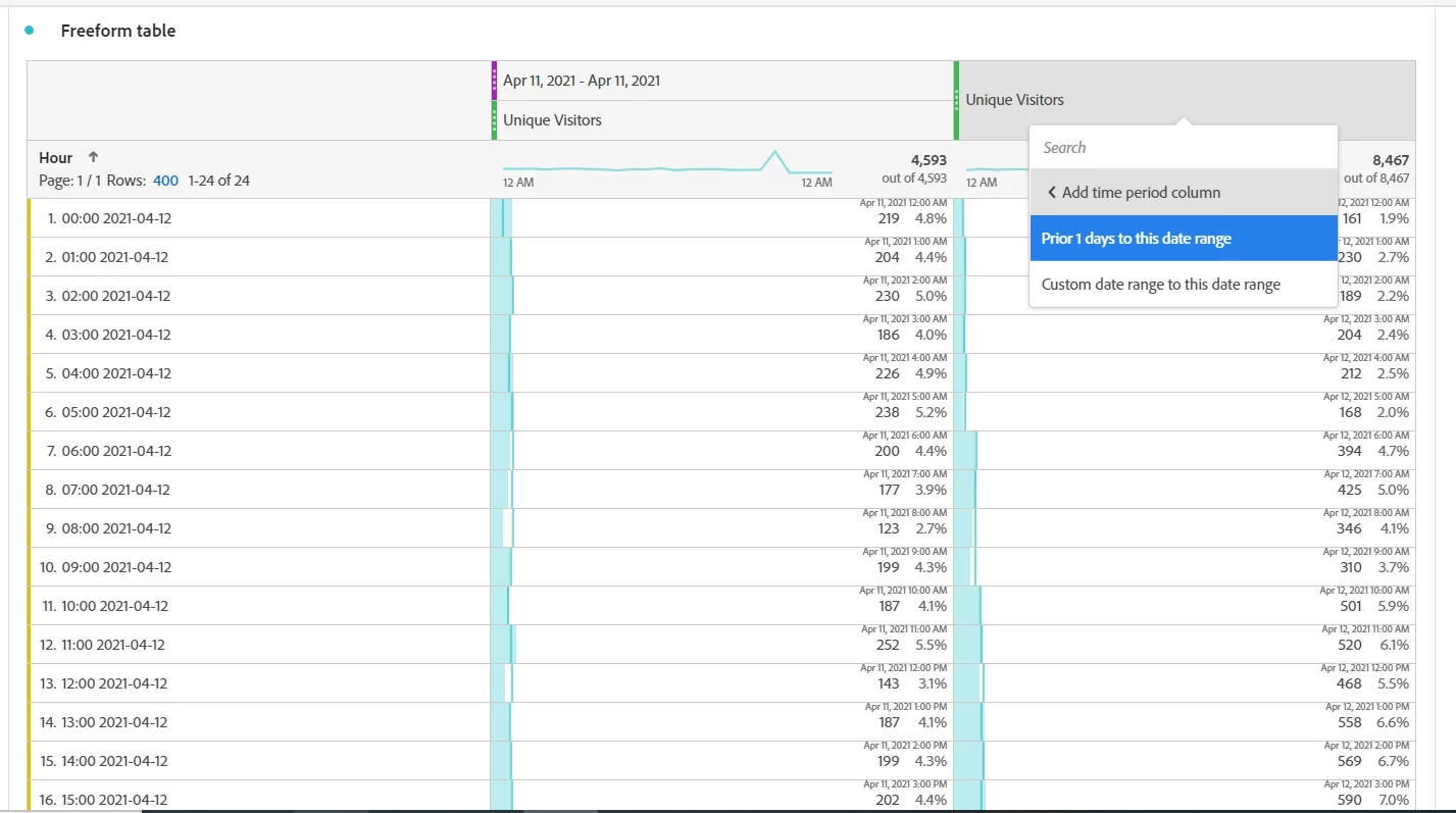 I am attempting to make an hourly dashboard in which the hour of today ex 5 PM is compared to the same exact hours yesterday. I've created a few multiple segments such as 24 individual segments with exclusions to create a rolling hourly comparison, however, none of my attempts have worked. Is anyone aware of a way to show a daily comparison of performance at the hourly level which excludes hours that haven't happened in the day vs. Yesterday only shows hours which are equivalent to Today.