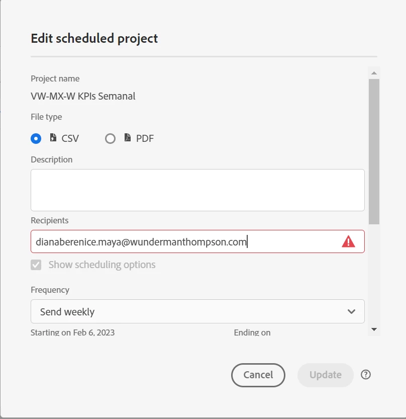 I can't schedule my project for users that don't have Adobe ID, is there a problem? I also have some projects scheduled in Reports that does not deliver the file in this year.