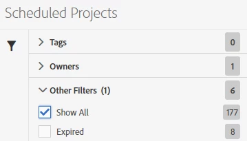 Today I wanted to renew some schedulings for workspace projects in the Adobe Analytic UI. Since the "renewal links" still do not work, I need the UI to manage the schedules. There are two filter options to filter the schedules: