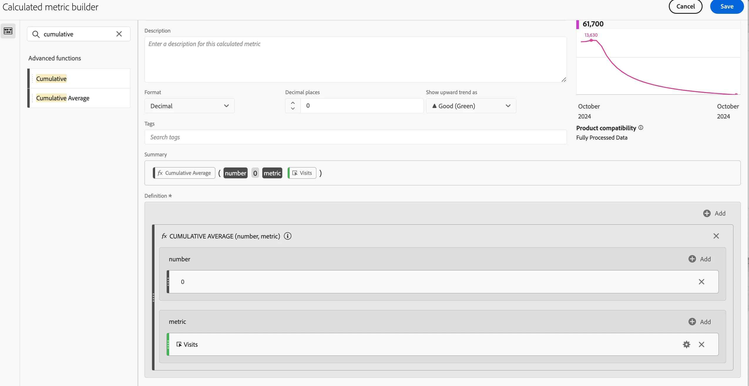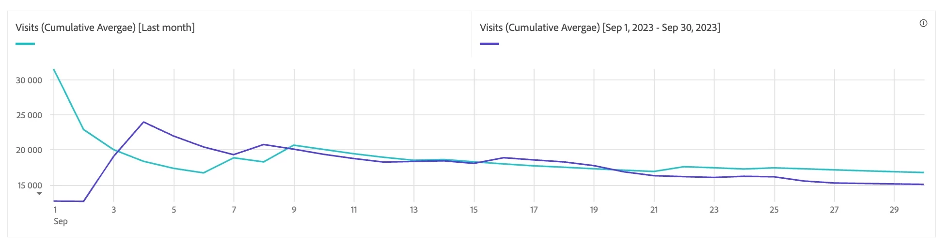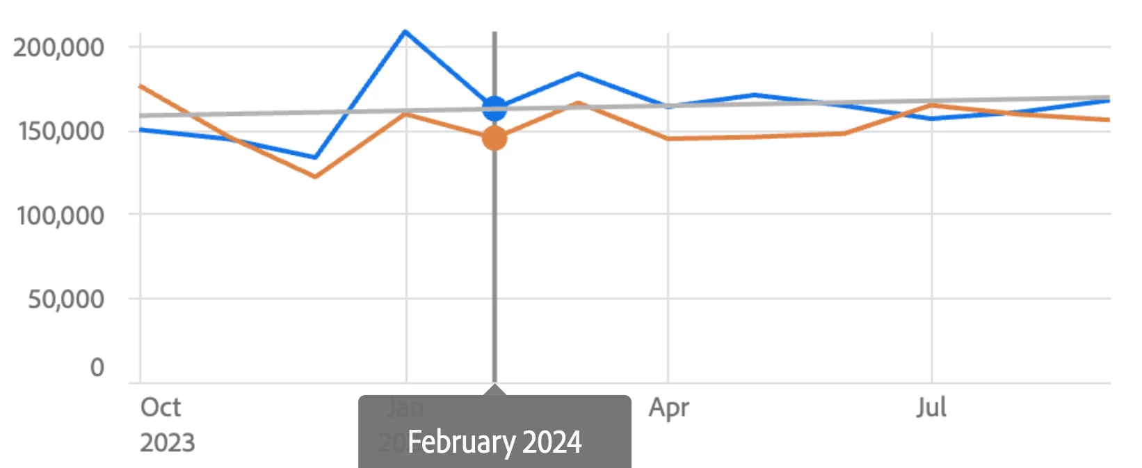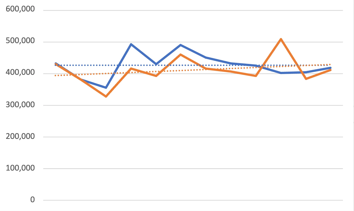Hey all, I'm brand new to Adobe Analytics, but I haven't found the answer to this question anywhere, so maybe you can help. I'm using a combo visualization to compare monthly values over the previous twelve months compared to the 12 months prior to that (each line represents 12 months). In the settings, I checked the box that said "Show trend line," but it doesn't show any trend lines unless I hover over the graph with my mouse (then the trend line is grey, so I have no idea which period of time it's referring to), which isn't helpful since I have lots of graphs to add to reports. Anyone know how to make them visible without me needing to hover over the graph? Also, is there a way to make a trend line match the color of the data line it represents? I'm including a picture of the way I need it to look with colored, dotted lines (I used Excel) and the way it looks now with my cursor hovering over it. I'd hate to go back to Excel with as much data as I have, but I will since trend lines are what my superiors want to see.