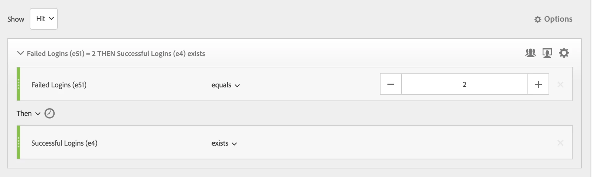 In this particular scenario, I'd like to find the number of successful 3rd attempt logins. Intuitively, I would think I need to find hits that belong to a visit where the visit had exactly 2 failed login attempts then a subsequent successful login on the 3rd attempt. Apparently using this syntax does not actually mean Failed Logins are aggregating to 2 events within the visit since my final count is unrealistically low. How would I find all hits that belong to a visit where exactly 2 success events then another success event occurred?