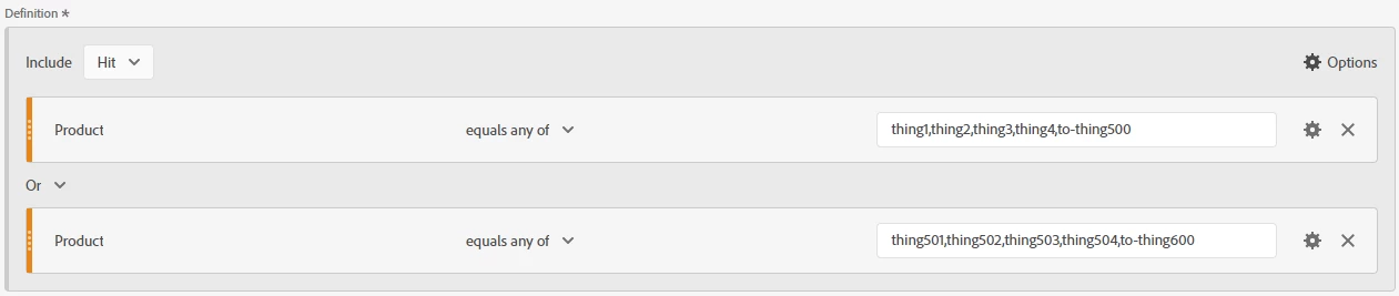 I would like to analyze in the workspace some metrics in combination with a 600 products list segment. I plan on making a segment where product hit equals any of those 600 hundred products, but when I do so there's a limit of 500 hundred items you can conditionate with the equals any of clause. Is there a way to avoid this limit or some workaround applicable here to avoid having to make 2 segments?