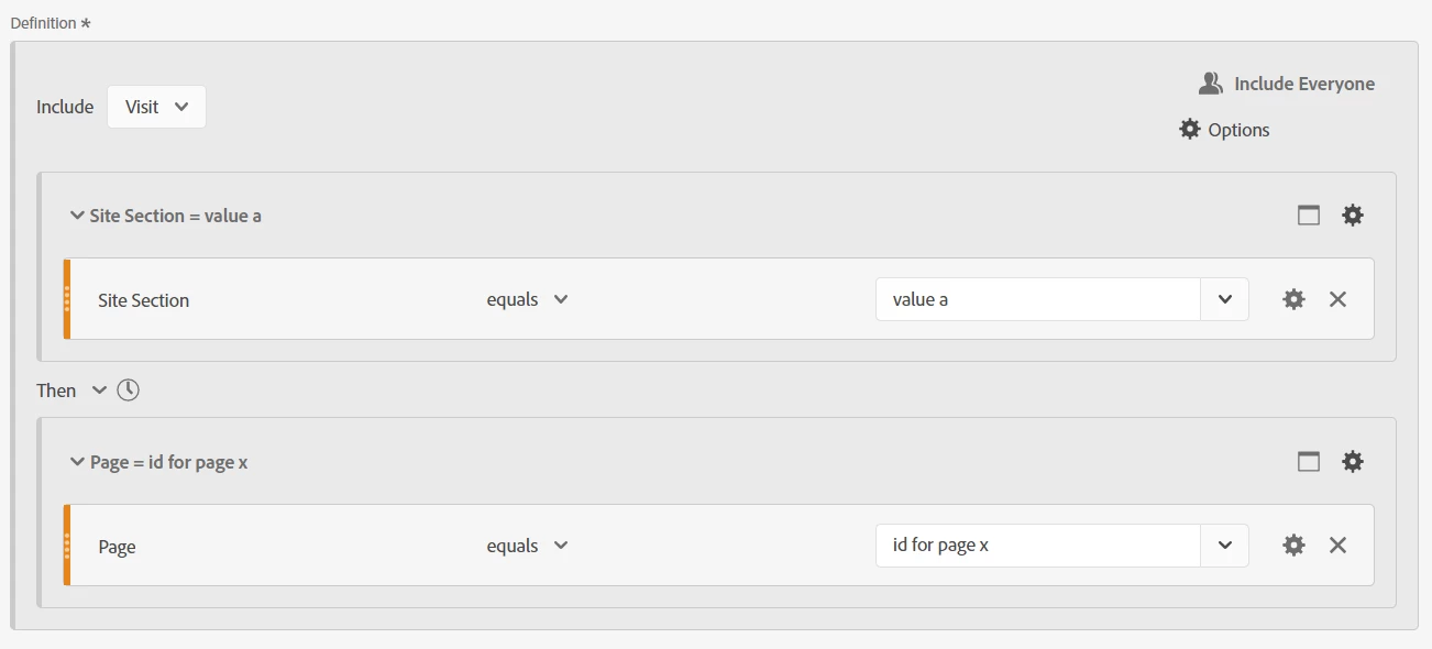 We would like to create a segment that looks at visits where a visitor had page views on a section of content (site section 2) at some point before visiting a specific page "x". They could have looked at the section a) right before page "x" or b) they could have viewed the section and then other pages before finally landing on specific page "x".