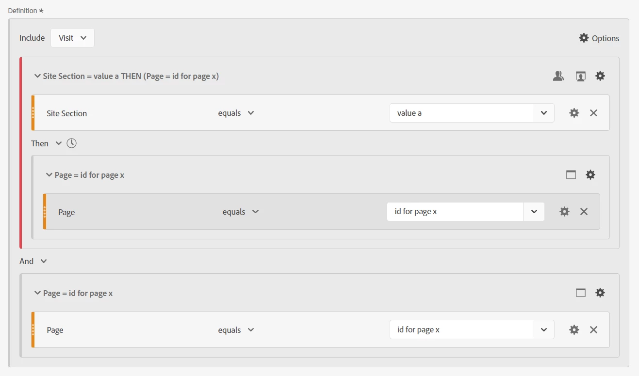 We are also interested in how to best create the opposite segment where visit did NOT include the specific site section 2 before landing on the specific page "x"