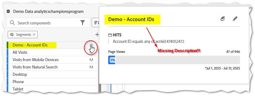 | What’s the problem or error? | Based upon my memory of past performance in Adobe Analytics, it was originally possible to hover over the information icon to view the description of any segment. Currently, this has changed to only show top initial values and no longer provides any description like it did in the past. |