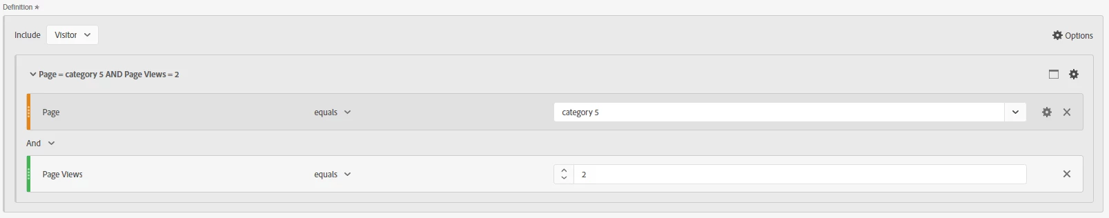 I guess this segment is correct because (As I understand) the segment filters Visitors who viewed Category5 page and had 2 page views (any page).