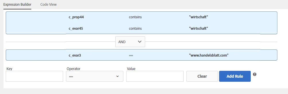 So, as you can see, this trait includes and "AND-Condition" with the domain (evar3) "www.handelsblatt.com.