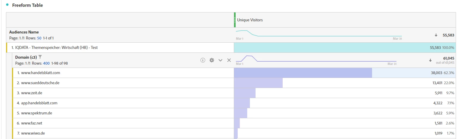Now, what suprises me, if i put this segment into Adobe Analytics and make a breakdown with domain (c3), how is it possible, that this breakdown includes all the others dimensions and not only the domain of the trait "www.handelsblatt.com"? Because the Trait Rule is, that Domain is "www.handelsblatt.com".
