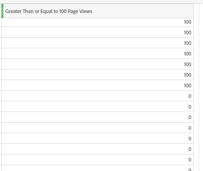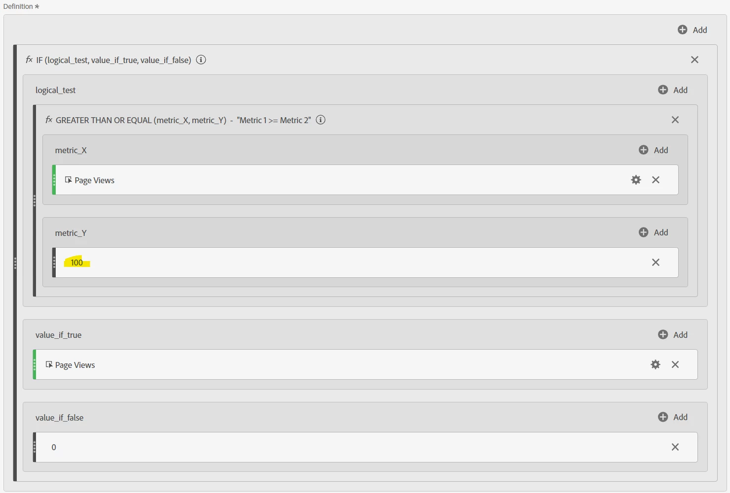 Now, one thing you can do (but it's not the most ideal), is to use a calculated metric using an IF statement and GREATER THAN OR EQUAL statement to restrict the page views for items over X (in your case 100), then if it's not, show "0", however, the pages will still show in the list in your table, but their PV count won't be included in the total.