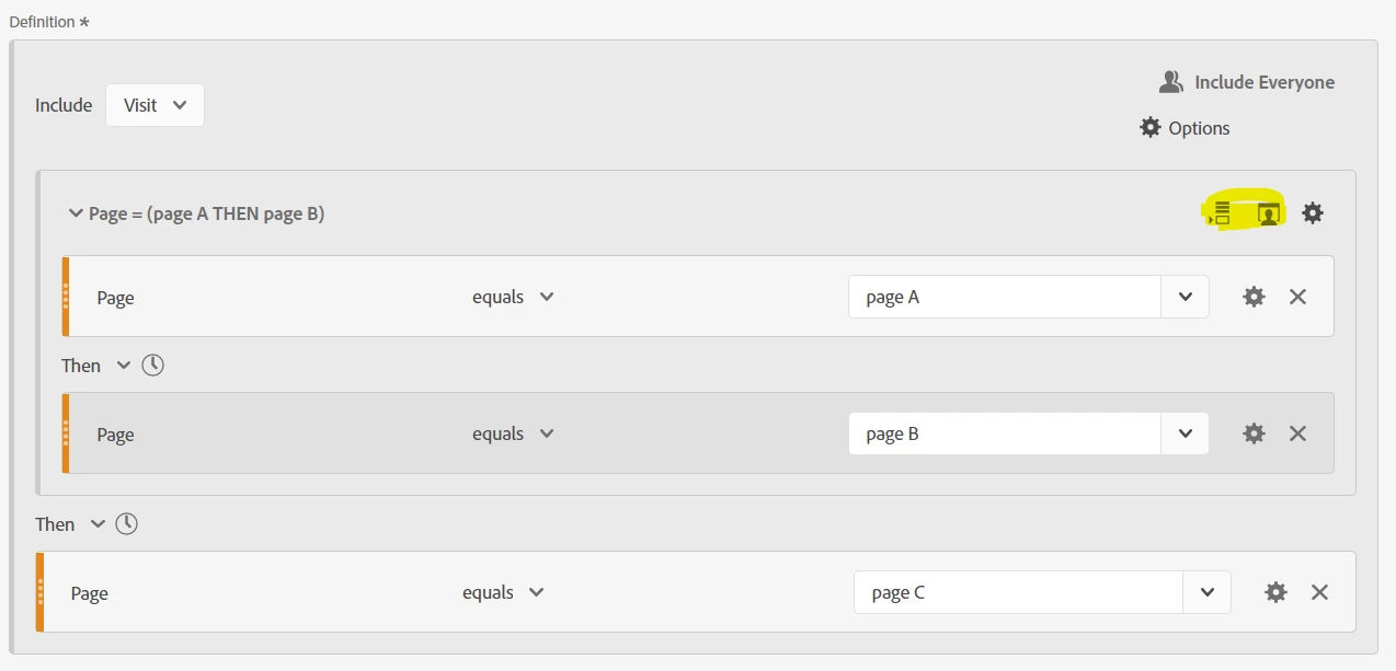 If you want the flow to be consecutive, you can use "Then within 1 Page View", instead of just "Then"