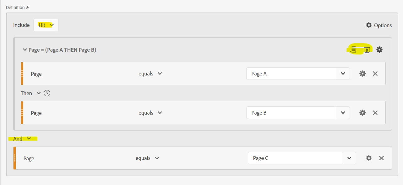 This will look for Visits that have the sequence A > B, that also hit C (but C has to come after the A > B flow), and will restrict the returned data to just the hits on Page C (that meet the criteria)