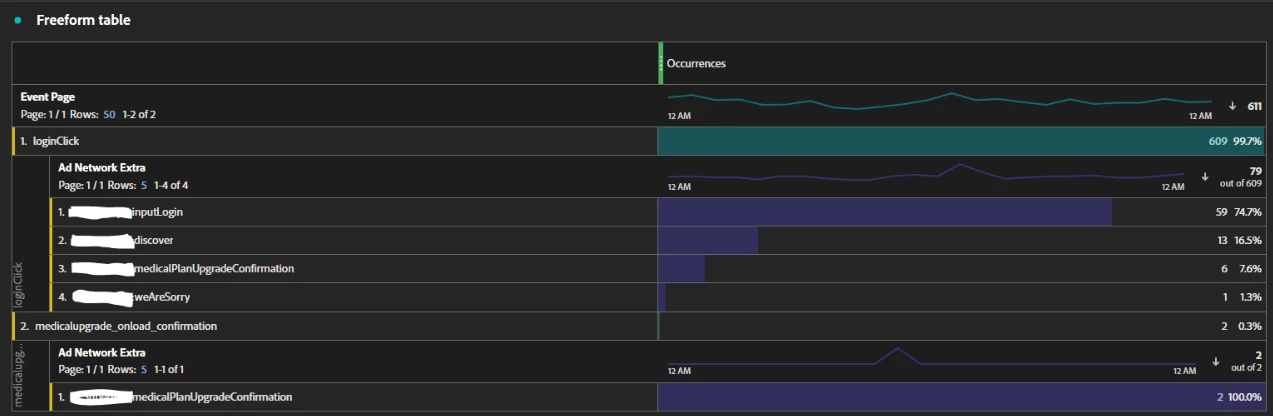 hi guys, i have a question for freeform table. As capture image above, i trigger 2 pageName (pageName config as evar13). We also see that in this image has break down section: Ad Network Extra (this one config as evar60). The query time on Jun 26, 2024. My question is why is the value of evar60 medicalPlanUpgradeConfirmation display on pageName evar13: loginClick. In my logic code evar60: medicalPlanUpgradeConfirmation only trigger when user trigger the medicalupgrade_onload_confirmation. And why the amount of occurrences on each Page is different: loginClick is 6 and medicalupgrade_onload_confirmation is 2