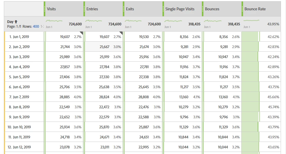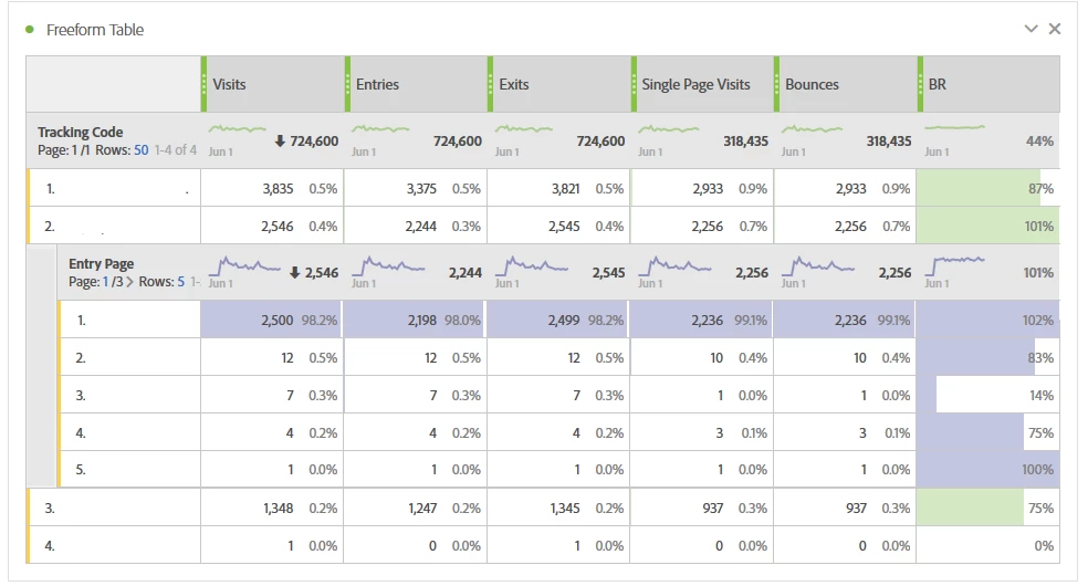 You can see that BR (bounce rate) is more than 100%. Single Page Visits is more than entries. Could you help me with this problem: