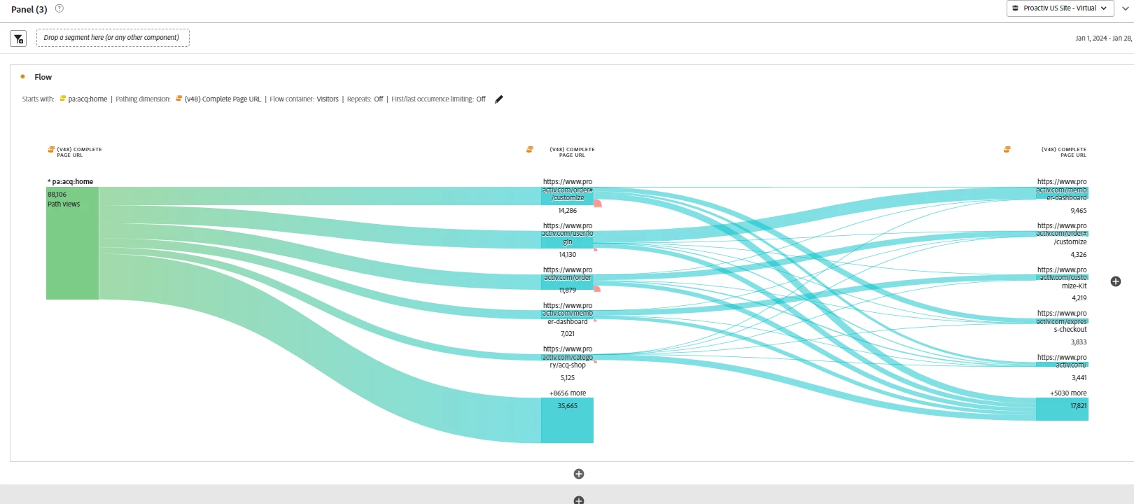 I'm new to adobe analytics, so please bare with me. I was asked to conduct a site path analysis starting from the homepage, which is the landing page on our website. On this home page, there's a call-to-action button which is the "shop now" button. Based on my research, I've realized that i have to use a flow visualization to examine how users flow from our homepage into other pages on our website. I built 2 flow Viz but it didn't answer the question, I will attach my latest Viz. My question is, How do i go about building this, assuming i want my flow to capture all the visits that arrived for the month at the official homepage and how they navigate from there.