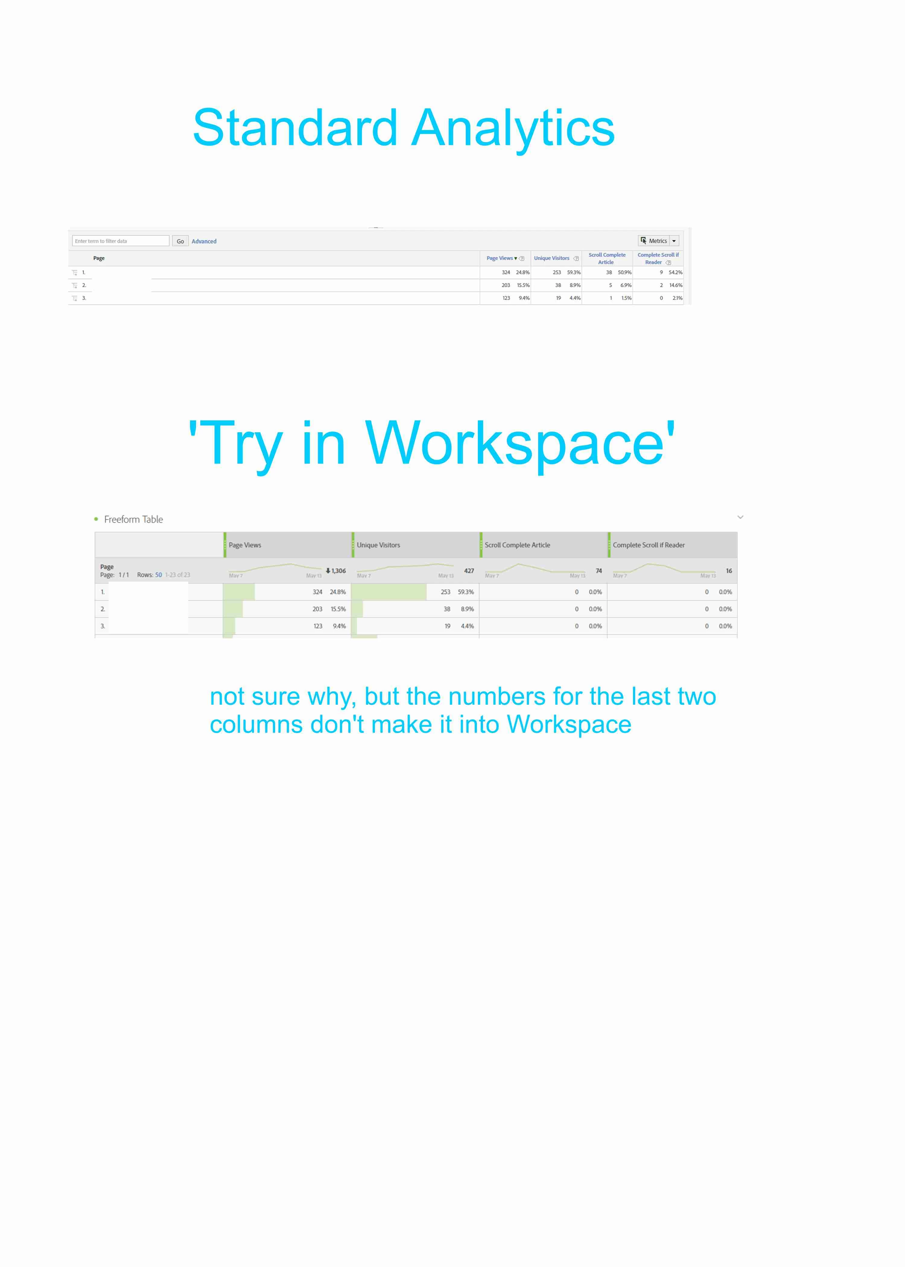 I love the new Analysis Workspace capability! Makes life so much easier and the results are compelling. I'm already planning on training several of the report end users on how to do their own data inquiry. I noticed, however, that some reports of mine (created in regular analytics environment) come across with zeros instead of the actual data when I use 'Try in Workspace'. The screenshot here shows what I mean. Not sure whether this is a bug or something on my end?