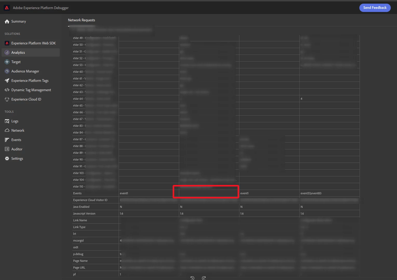 Could events be overwritten between them being set and when the beacon is sent? I can see there is something blurred out for "link name" so I can see this is an action and not a page view... how are you setting the events? If you are setting them in a separate rule, you should be aware that actions are a bit different from page views....
