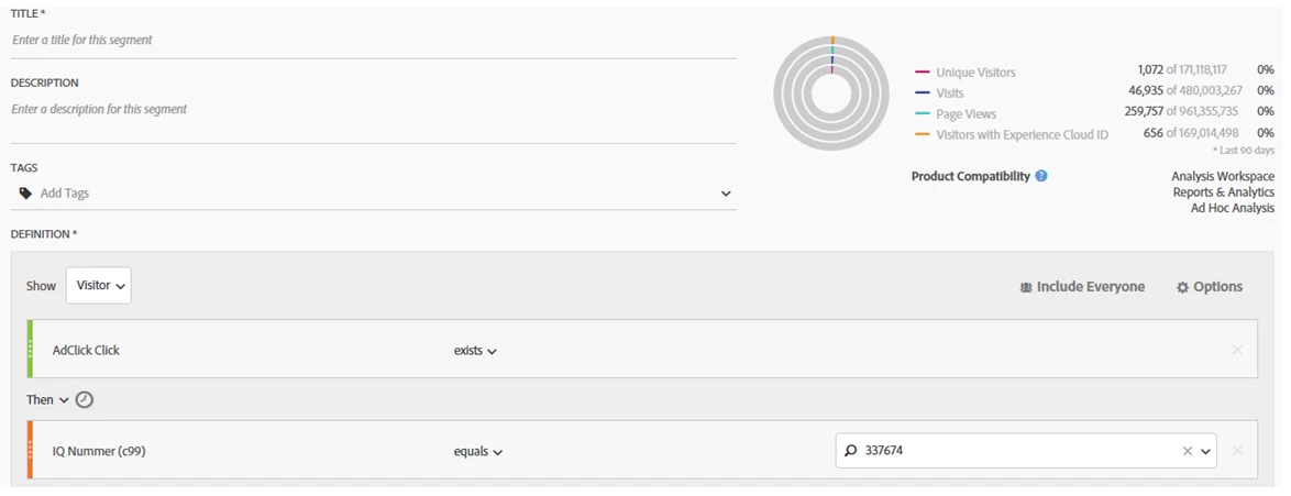 if not, how can I narrow the circle so that only those who have clicked on an advertisement and then landed on the content hub are shown to me. another idea from me was an "and-condition". So for example: "iq nummer" equals xxx AND "AdClick Click" exists". But in this case i would see all people who are a part of the Content hub and clicked on any ad, Right?