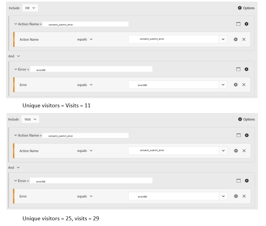The Hit-level segment has 11 visitors/visits, whereas the visits level segment has 25 visitors and 29 visits.