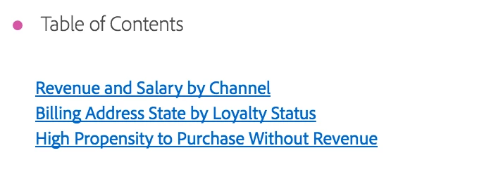 What I'd love is a new Visualization that users can drag in from the left panel that is automatically filled with intra-links to all visualizations and auto-extracts the name of each visualization into the ToC. Even better, if we could uncheck any visualizations that don't need to be linked.