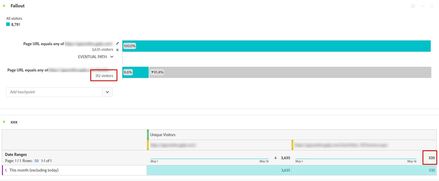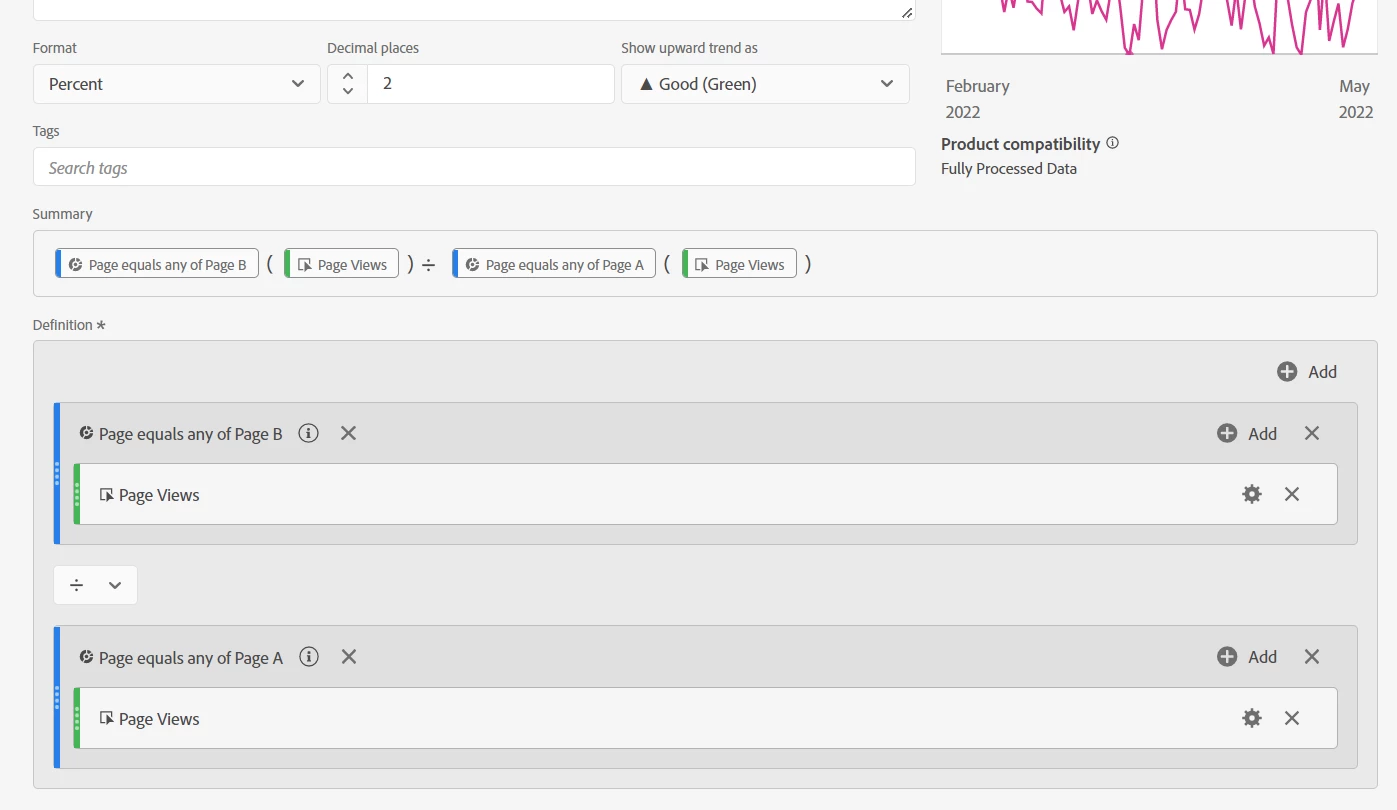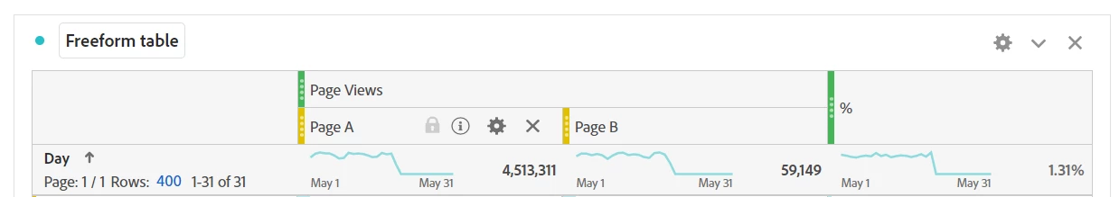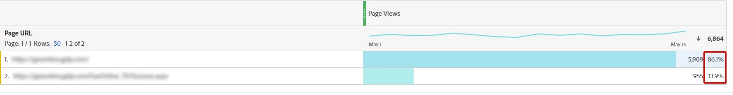 I want to make a percentage comparison between two rows of a one-column table. From the x page views of the landing page, how it compare to the page view of the last page of the journey. However, I need the table to consider the first row as 100% but now it shows the % of the total page views (both rows together).