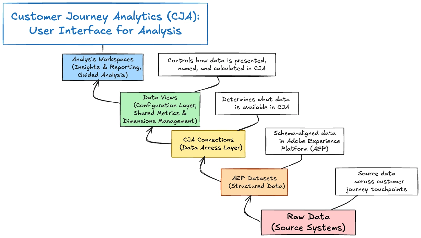 Data Views serve as the critical bridge between your raw data Adobe Experience Platform (AEP) datasets through to CJA Connections and the Analysis Workspaces where practitioners derive insights. While Connections determine what data is available, Data Views determine how that data is presented to users by controlling everything from naming conventions to metric calculations and intrinsic attribution models.