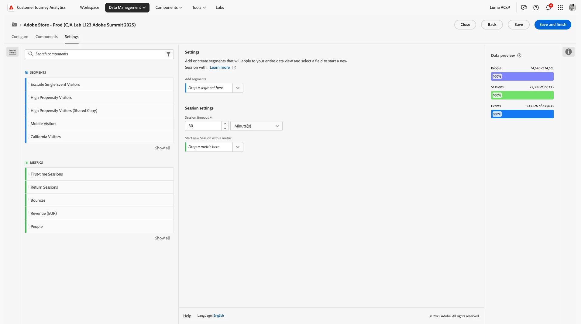 - Settings Tab: Where you define global view settings that apply across the entire Data View, including session timeout parameters and segment settings. Any segment defined here is automatically applied to all reports you run in Workspace.
