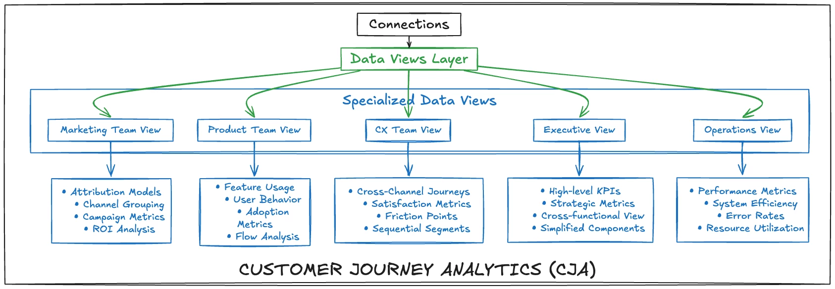 A well-designed CJA implementation functions as a universal translator for diverse teams. While everyone shares the same underlying information, each specialist needs it presented in their "native language" to be effective. Marketing professionals speak in terms of campaign attribution and ROI. Product teams understand feature adoption rates and user flows. Customer experience analysts communicate through journey maps and satisfaction scores. Data Views act as specialized translators, transforming raw data into the precise language and context each team needs without changing the core information. Similar to how a skilled interpreter keeps the meaning intact while adjusting the delivery, carefully configured Data Views show the same customer journey data in ways that connect with different business functions. This allows everyone to get the most value from a unified analytics system.