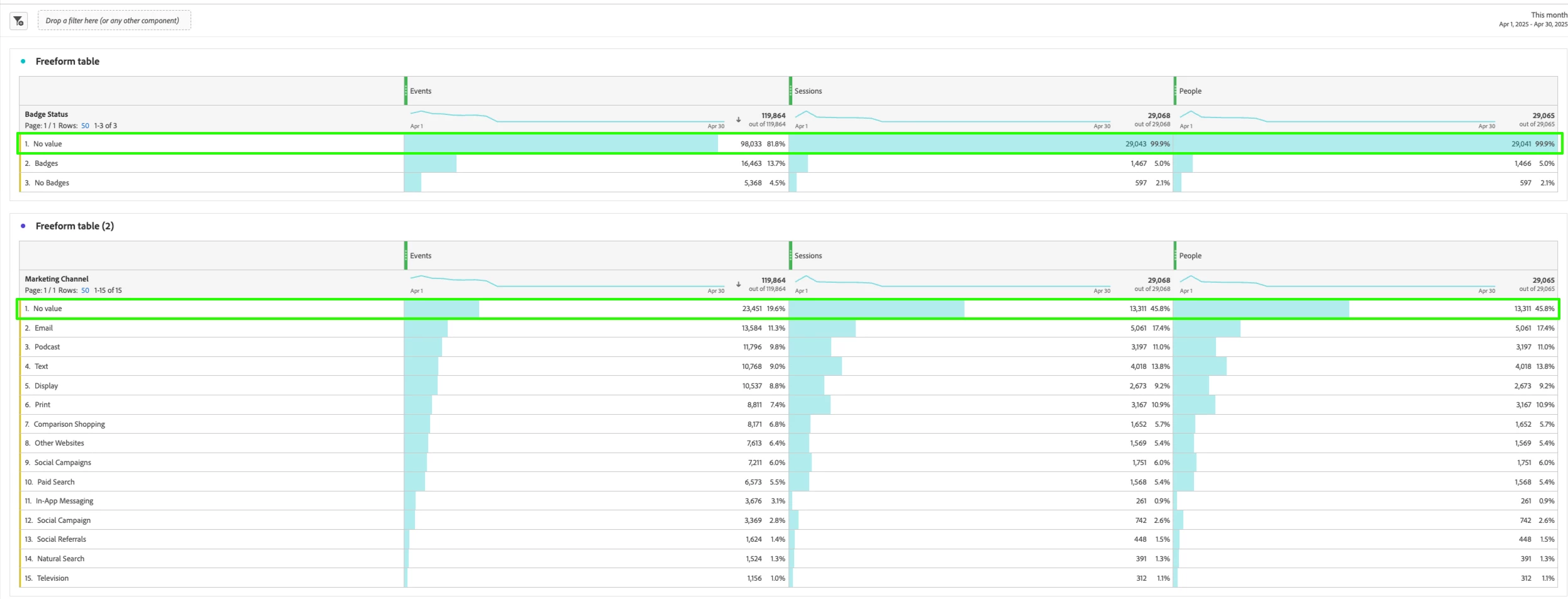 While many "No Value" instances are expected and natural in your data collection process, certain scenarios should warrant thorough investigation. These particular cases often serve as warning signs, potentially indicating underlying technical issues, gaps in data collection methodology, or fundamental implementation problems that could impact the integrity of your analytics. Such scenarios may compromise not only the accuracy of your data but also the reliability of insights derived from CJA. When "No Value" appears in these contexts, it frequently suggests deeper systemic issues that require careful examination and prompt remediation. These situations deserve heightened attention because they can represent breakdowns in your data collection infrastructure, gaps in your implementation strategy, or technical misconfigurations that could have far-reaching implications for your analytical capabilities. Here are situations where "No Value" appearances warrant comprehensive review, thorough analysis, and strategic remediation efforts: